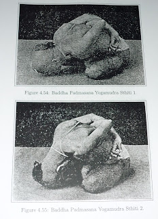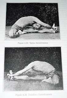 This has 16 vinyasas. The 8th and 9th vinyasas are the asana sthiti. The other vinyasas are like pascimottanasana. Study the pictures (Figures 4.52, 4.53) and learn how to keep the gaze. In this asana, one must do puraka kumbhaka..." p103