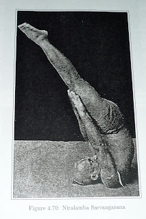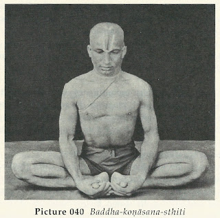 What Krishnamachaya seems to be doing is bringing mind stilling techniques found in Patanjali into the asana itself, stilling the mind while in the asana. We do this already by seeking to follow the breath, focusing on drishti, on bandhas but it doesn't always help does it, our minds are still too often all over the place. And perhaps we go for ever more complicated asana in an attempt stay concentrated when perhaps with the most appropriate attitude/meditation technique we can still the mind in the most straight forward of asana.