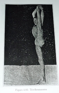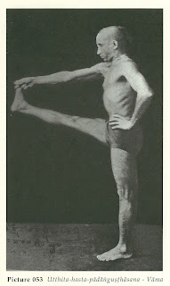 "...First, push the chest forward and stand erect with equal balance. While standing this way, make sure that the head, neck, back, hips, arms and legs are aligned properly and gaze at the tip of the nose. The feet must be kept together. Now, raise one leg up slowly and maintain this position with the extended leg kept straight out in front at the height of the navel. The knee should not bend and the leg must be kept straight for the entire time that it is being raised. After the leg has been raised about 3/4 of the way without any assistance, take the first three fingers of the corresponding hand (the same as whichever leg was raised) and tightly clasp the big toe of the raised foot. Remain in this position for some time. Keep the other hand on the hip. Inhalation and exhalation of the breath must be slow and of equal duration. One says the sthiti is correct if there is the same measure of distance between the standing leg and the raised leg. In this there are many other forms.