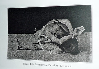 The 14th vinyasa is marichasana sannaha sthiti on the left side. This is demonstrated in the 3rd picture. The 15th vinyasa is the left-side marichasana paristhiti. This is demonstrated in the 4th picture. In the 14th vinyasa do puraka kumbhaka and in the 15th vinyasa do only recaka..." p115