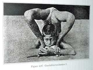 Next, do the 7th vinyasa as shown in the second picture. This is called supta ganda bherundasana. In this asana sthiti and in the preliminary positions, do equal recaka puraka kumbhaka. Keep the gaze fixed on the midbrow. This must not be forgotten". p142