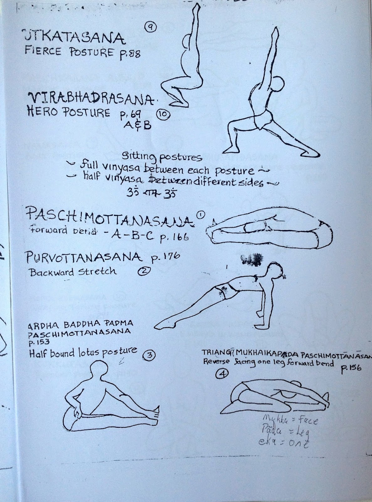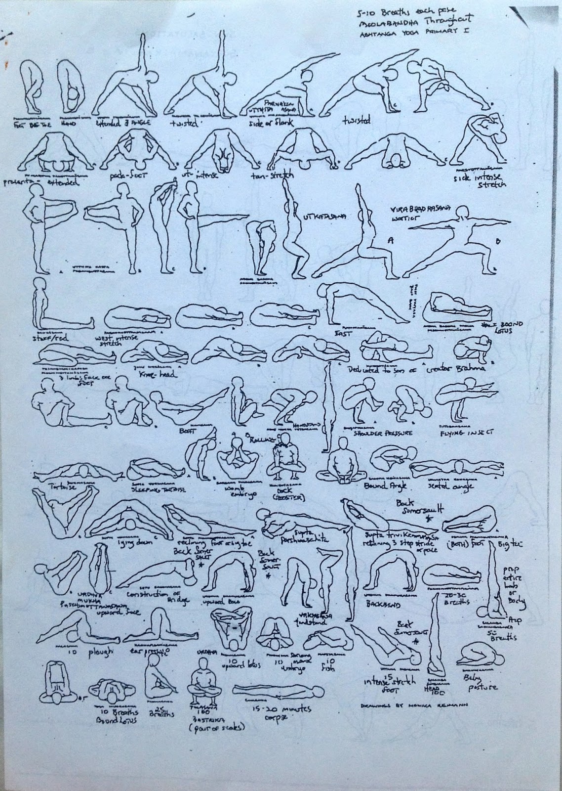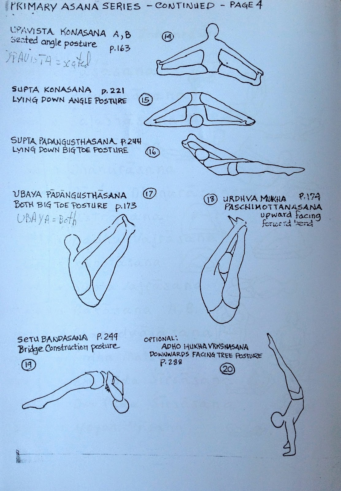 Kristina turned up with an old file of Ashtanga material last night, gave it to me to go through to see if there was anything of interest. Yep, all kinds of treasures buried away. What I loved most though were all these old illustrations, 'cheat sheets', of the Ashtanga series, I love them and couldn't wait to share.