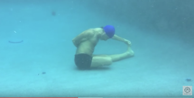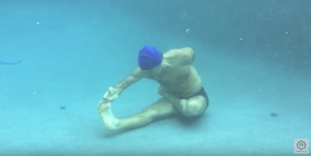 In this practice I take a breath in, hold my breath, go underwater and get into a posture, hold for some time floating just under the surface, then exhale fully and sink down underwater (to the bottom if it is not far!) and hold my breath out and perform uddiyana bandha, mula bandha, nauli and lauliki (rolling my abdomen with my chest expanded etc). Then, I swim to the surface (often still in pose such as the lotus as in the video here) and when I break the surface I inhale to begin the next posture. I regularly practice a 30 minute sequence of up to 30 postures in this manner".